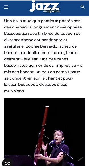 À l'occasion de cette carte blanche proposée par le festival Jazz d'or, Sophie Bernado chanteuse et bassoniste propose une collaboration avec Joachim Florent et Marie-Pascale Dubé avec qui Sophie a précédemment collaboré. Ils invitent la vibraphoniste Taiko Saito dans cette création inédite. Une invitation au voyage se dessine dans le choix de l'instrumentarium.