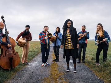Fidel Fourneyron (Trombone, compositions, conception) • Emma Lamadji (Voix) • Clément Janinet (Violon) • Vassilena Serafmova (Marimba, percussions) • Thibaud Soulas (Contrebasse) • Melissa Hié (Djembé, balafon, percussions) • Ophélia Hié (Balafon, doums, percussions)