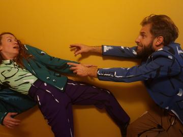 Ce tandem poétique sans parole nous plonge dans l’intimité de deux personnages qui, entre attirance et répulsion, essaient de se comprendre, de s’approcher, de s’explorer et surtout, qui incarnent le besoin vital et inconditionnel que nous avons d’être en relation. Les jeux d’attirance et de friction entre eux révèlent aussi leurs propres ombres et invitent chacun à considérer, apprivoiser et soigner des blessures oubliées, car pour construire avec l’autre, le regard sur soi devient inévitable et le désir de guérison grandit. Tel un film sans paroles, ces deux architectes de l’intime déroulent leur histoire sur un fil musical. Le piano, le violon, la voix, les percussions corporelles, la danse sont leurs ingrédients gravitant autour d’un langage brut et poétique, celui de la musique des corps.