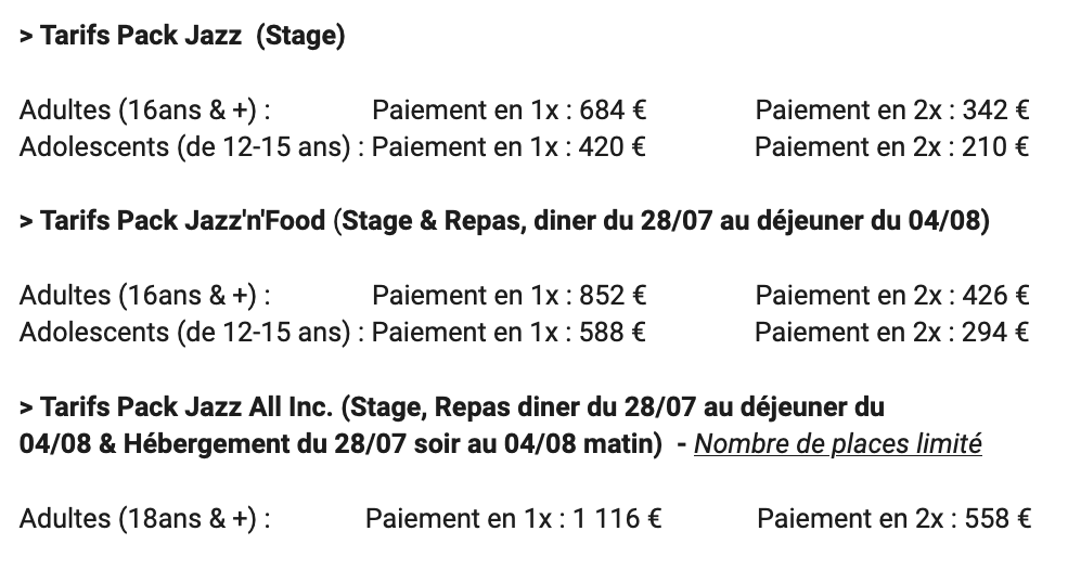 « Ce stage s’adresse à tous les instrumentistes et vocalistes possédant une technique suffisante (niveau 2ème cycle minimum) et pratiquant déjà régulièrement l'esthétique jazz en ensemble. Une solide connaissance de l'harmonie jazz (niveau 2ème cycle jazz) est requise pour les pianistes et les guitaristes. Encadrés par des artistes de premier plan de la scène jazz, les stagiaires pourront se consacrer durant une semaine aux joies de l’improvisation, de l'écoute, de l'interprétation et du jeu d'ensemble. Ils développeront leurs capacités musicales (skills) au cours de séances de pratique instrumentale, vocale et de pratique collective. Ils bénéficieront également de modules spécifiques autour de notions et d'outils pour enrichir leur expérience musicale. Cette semaine de partage sera ponctuée de jam sessions et se clôturera par un concert des stagiaires au cœur du village de Marciac. » Leila Olivesi
