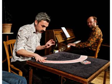 Deux pratiques différentes pleines de concordances, et deux personnalités pour nous les présenter. Dans l'arène, un magicien et un musicien font le pont entre leurs deux disciplines, se renvoyant la balle avec humour et décontraction, offrant au public une joute verbale tant visuelle que sonore. Et tout au long du spectacle, une conversation sur l'art d’improviser guidée par les émotions avec le public et bien sûr la magie !