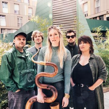 • Samedi 26 juillet à 15h, c’est au tour du collectif NUBU d’occuper les lieux. Groupe lauréat de Jazz Migration 2024, cette fanfare énergisante oscille entre folk anglo-saxonne, jazz et harmonies Renaissance en associant instruments de factures anciennes et modernes. NUBU invente son propre folklore et fait se rencontrer avec malice des instruments d’époques différentes : le serpent (Elisabeth Coxall), ancêtre européen du tuba, le flugabone (Victor Auffray), conçu plus récemment pour sa praticité au sein des marching band, le trombone (Thibaut Du Cheyron), les percussions à peaux animales (Guillaume Lys), la contrebasse (Marion Ruault) dont le bois fait écho à celui du serpent.
